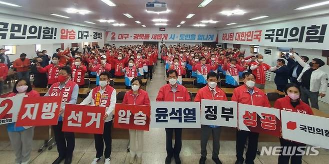 [대구=뉴시스] 정창오 기자=국민의힘 6.1 지방선거 경북도당 선거대책위원회가 16일 오후 대구시 수성구 범어동에 있는 당사 강당에서 지방선거 압승과 윤석열 정부 성공을 위한 출정식을 열고 있다. 2022.05.16 jco@newsis.com