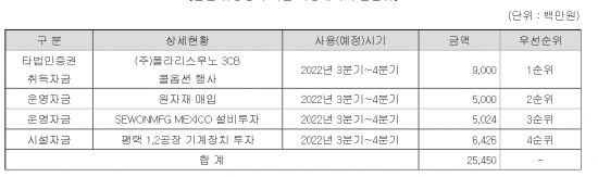 회사 측은 콜옵션을 행사해 폴라리스우노 지분을 확보하는 데 약 90억원, 원재료 매입하는 데 약 50억원을 사용한다고 설명했다. 세원MFG 멕시코 기계설비와 평택 1, 2공장 자동화설비에 각각 50억원, 64억원을 투자한다.