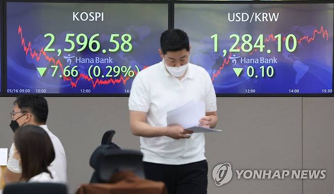 이날 코스피는 전 거래일보다 7.66포인트(0.29%) 내린 2,596.58에 장을 마쳐 2거래일 만에 다시 2,600선을 하회했다. 2022.5.16