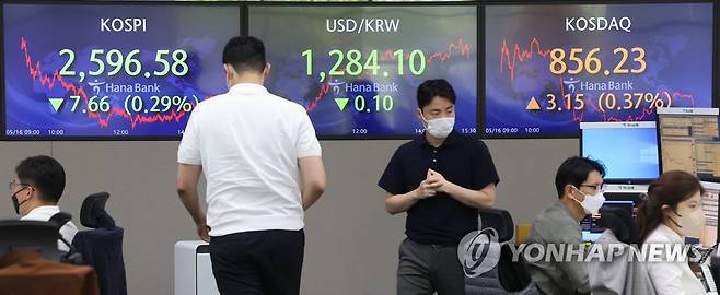 이날 코스피는 전 거래일보다 7.66포인트(0.29%) 내린 2,596.58에 장을 마쳐 2거래일 만에 다시 2,600선을 하회했다. 2022.5.16