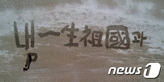 (포항=뉴스1) 최창호 기자 = 서예가 김동욱 씨가 16일 경북 포항시 북구 영일대해수욕장 백사장에서 박정희 전 대통령의 어록인 "내 일생 조국과 민족을 위하여"를 쓰고 있다.(김동욱 씨 제공)2022.5.16/뉴스1