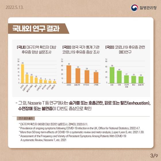 ①코로나19 후유증에 대해 국내외에서 조사 연구가 진행 중에 있으며, 연구의 목적, 대상자, 조사기간에 따라 다양한 연구 결과들이 보고되고 있습니다.
