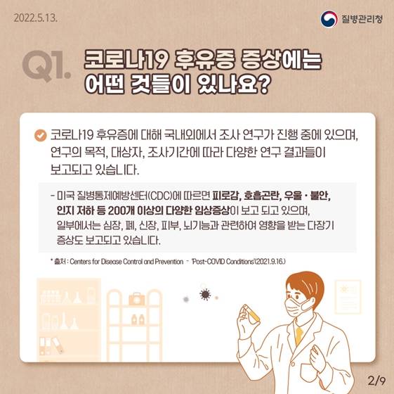 ② 아직 명확하게 밝혀야 할 것들이 많지만, 시간 경과에 따라 증상이 완화되는 경향이 있으므로 현 단계에서는 의료기관을 방문하여 증상에 따른 대증치료를 받으시기 바랍니다.