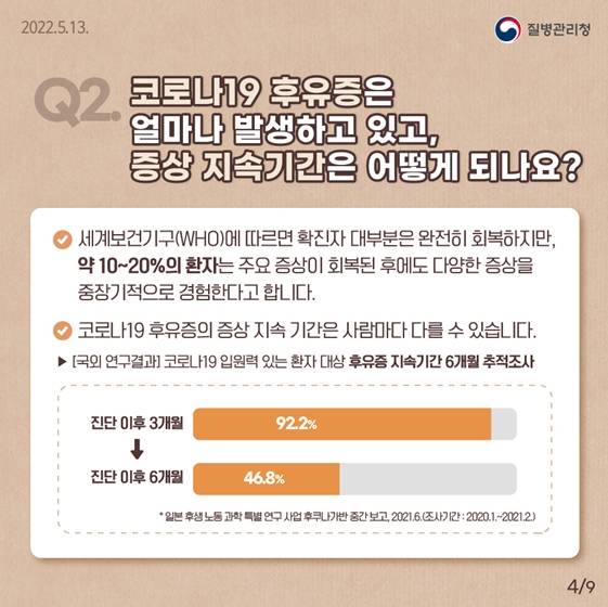 ① 세계보건기구(WHO)에 따르면 확진자 대부분은 완전히 회복하지만, 약 10~20%의 환자는 주요 증상이 회복된 후에도 다양한 증상을 중장기적으로 경험한다고 합니다.