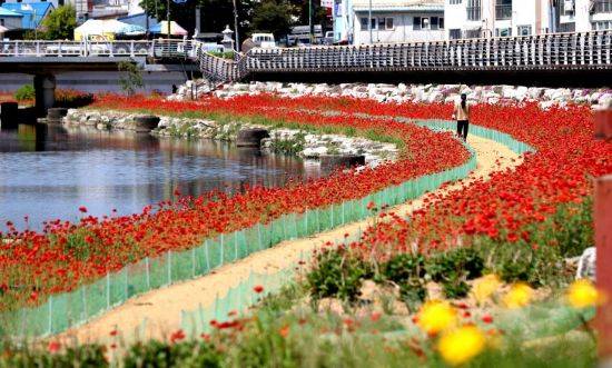 지난달 말부터 꽃망울을 터뜨리기 시작해 이달 중순 만개 예정이며 주민들의 큰 호응 속에 천변가에 핀 붉은 물결의 양귀비 장관은 내달까지 지속될 예정이다.