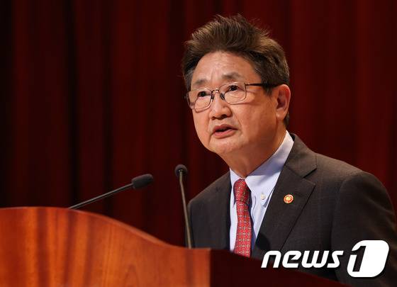 (서울=뉴스1) = 박보균 신임 문화체육관광부 장관이 16일 세종시 정부세종청사 문체부 대강당에서 열린 취임식에서 취임사를 하고 있다. (문화체육관광부 제공) 2022.5.16/뉴스1