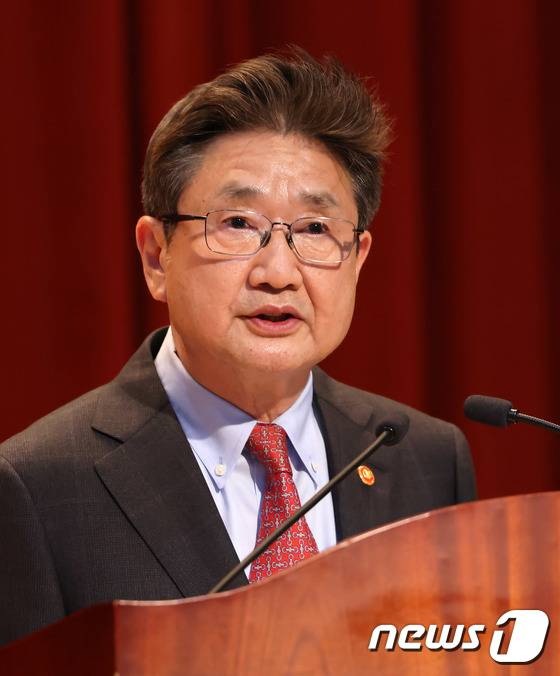 (서울=뉴스1) = 박보균 신임 문화체육관광부 장관이 16일 세종시 정부세종청사 문체부 대강당에서 열린 취임식에서 취임사를 하고 있다. (문화체육관광부 제공) 2022.5.16/뉴스1