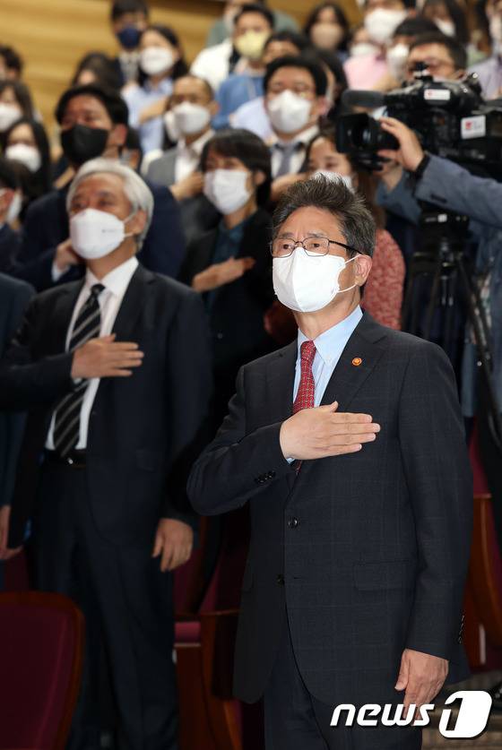 (서울=뉴스1) = 박보균 신임 문화체육관광부 장관이 16일 세종시 정부세종청사 문체부 대강당에서 열린 취임식에서 국기에 대한 경례를 하고 있다. (문화체육관광부 제공) 2022.5.16/뉴스1