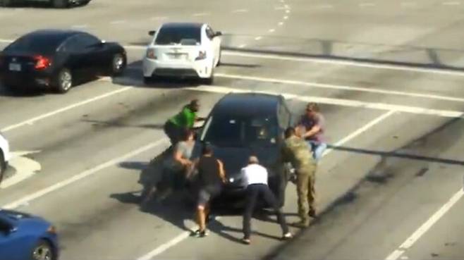 이에 여성이 손을 흔들어 주변에 도움을 요청하자, 도로에 있던 운전자들이 하나둘 뛰어나와 온몸으로 차를 멈춰 세웁니다.