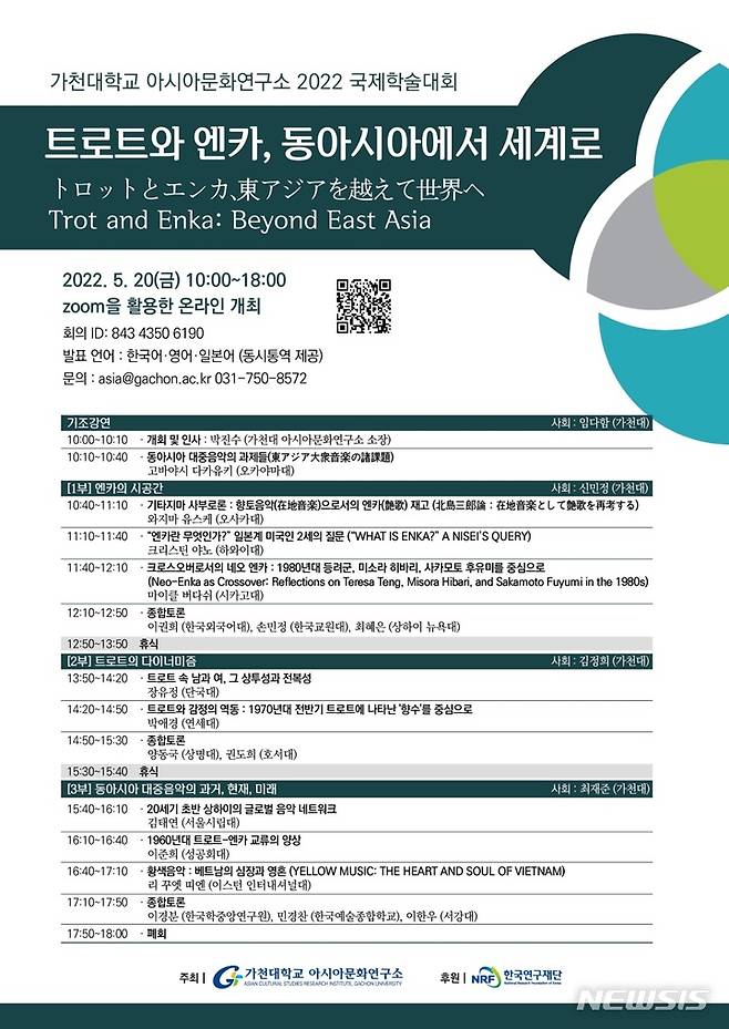 [성남=뉴시스]신정훈 기자 = 가천대학교 아시아문화연구소가 오는 20일 '트로트와 엔카, 동아시아에서 세계로'를 주제로 비대면 국제학술대회를 연다.