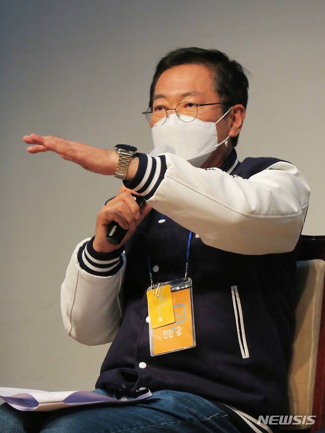 [인천=뉴시스] 김동영 기자 = 16일 오후 인천 미추홀구 인하대학교 본관 하나홀에서 열린 ‘박남춘 인천시장 후보와 함께하는 청춘남춘 소통간담회’에 참석한 더불어민주당 박남춘 인천시장 후보가 학생의 질문에 답하고 있다. 2022.05.16. dy0121@newsis.com