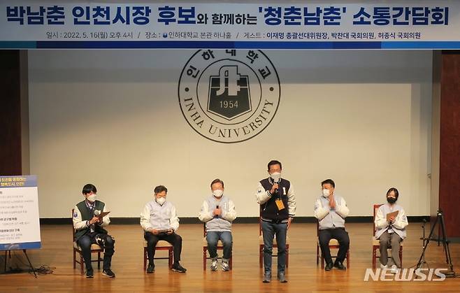 [인천=뉴시스] 김동영 기자 = 16일 오후 인천 미추홀구 인하대학교 본관 하나홀에서 열린 ‘박남춘 인천시장 후보와 함께하는 청춘남춘 소통간담회’에 참석한 더불어민주당 박남춘 인천시장 후보가 학생의 질문에 답하고 있다. 2022.05.16. dy0121@newsis.com