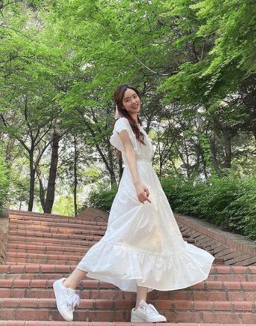 진세연은 화이트 원피스에 화이트 운동화를 신고 여름 요정 같은 비주얼을 뽐내고 있다.
