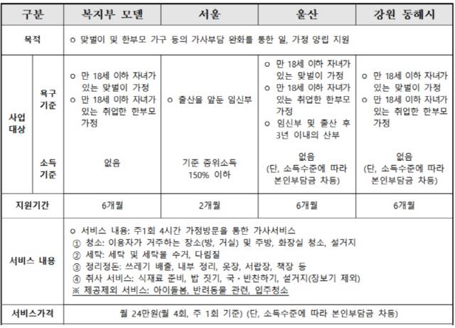 강원도 동해와 서울, 울산 등에 사는 맞벌이와 한부모 가정이 가구 소득에 따라 월 2만4000원에서 14만4000원을 내면 한 달에 4차례(주당 1회, 4시간) 청소, 세탁, 요리 등 가사지원 서비스를 받는 정부 시범사업이 처음 시작된다.