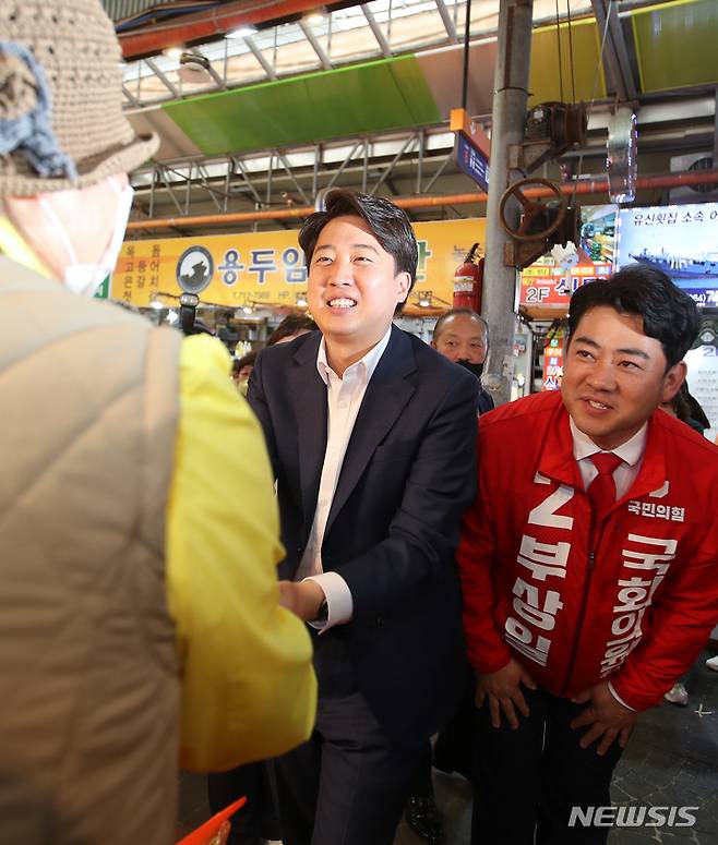 [제주=뉴시스] 우장호 기자 = 국민의힘 이준석 대표가 16일 오후 제주시 동문재래시장을 찾아 상인들과 인사하고 있다. 2022.05.16. woo1223@newsis.com