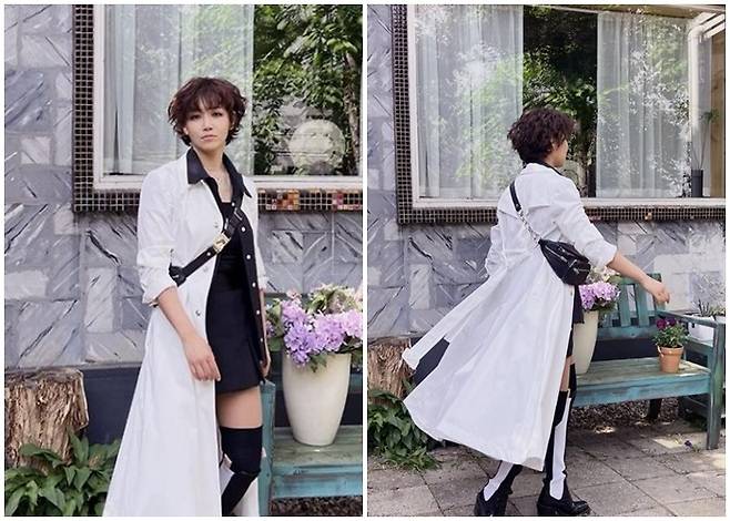 이유리는 짙은 메이크업과 웨이브가 들어간 숏컷 헤어스타일에 부츠와 긴 코트로 카리스마 넘치는 스타일링을 완성했다.