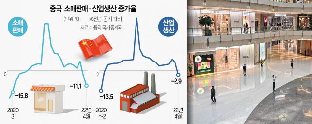 16일 중국에서 발표한 소비·생산·투자 관련 지표들을 두고 시장에서는 충격적이라는 반응이 나온다. 전월에 비해 악화될 것으로는 예상했지만 실제 나온 성적표가 예상치에도 못 미친 것은 물론 2년 전 코로나19 확산 초기 수준으로 떨어졌기 때문이다. 중국의 4월 소매판매는 2조 9483억 위안(약 556조 원)으로 전년 동월 대비 11.1%나 감소했다. 시장 전망치(-6.1%)에 크게 못 미칠 정도로 상황은 심각했다.