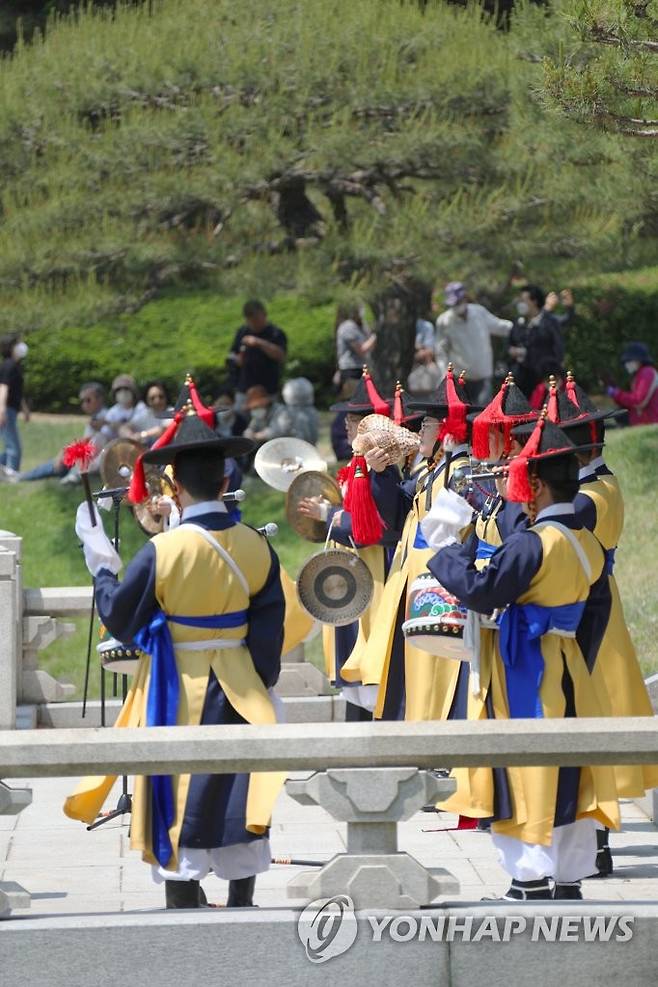 (서울=연합뉴스) 국립국악원이 지난 11일부터 청와대 본관 앞 대정원에서 매일 오전 11시 30분부터 12시까지 30분간 민속악단의 판굿 공연과 정악단 대취타 연주를 선보이고 있다고 16일 밝혔다. 사진은 국립국악원 대취타 연주. 2022.5.16 [국립국악원 제공. 재판매 및 DB 금지]
