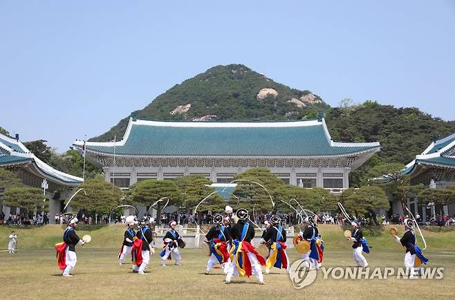 (서울=연합뉴스) 국립국악원이 지난 11일부터 청와대 본관 앞 대정원에서 매일 오전 11시 30분부터 12시까지 30분간 민속악단의 판굿 공연과 정악단 대취타 연주를 선보이고 있다고 16일 밝혔다. 사진은 국립국악원 민속악단 판굿 공연. 2022.5.16 [국립국악원 제공. 재판매 및 DB 금지]
