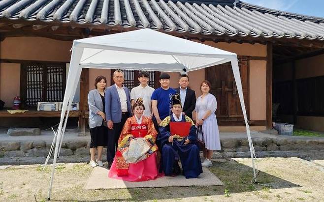 이날 전통혼례의 주인공은 부부의 연을 맺은지 50년이 된 안모(80)·강모(72)씨 부부다. 부부는 함양군 안의면에서 자그마한 빵집을 운영하며 삼남매를 시집 장가 다 보내고 예쁜 손주까지 얻었다.