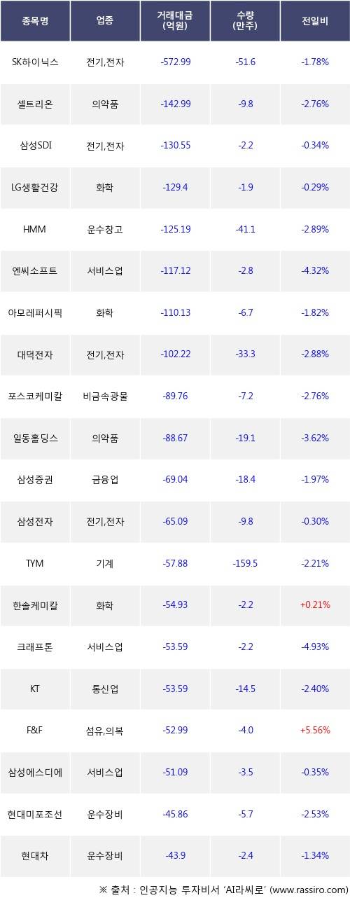 외국인 투자자의 순매도 상위 20개 종목은 SK하이닉스, 셀트리온, 삼성SDI, LG생활건강, HMM, 엔씨소프트, 아모레퍼시픽, 대덕전자, 포스코케미칼, 일동홀딩스등이다.