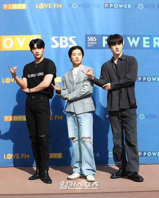 그룹 저스트비의 임지민,이건우,배인이 오후 서울 목동 SBS방송국에서 열리는 '박소현의 러브게임' 사전녹음에 참석하며 포즈를 취하고 있다.