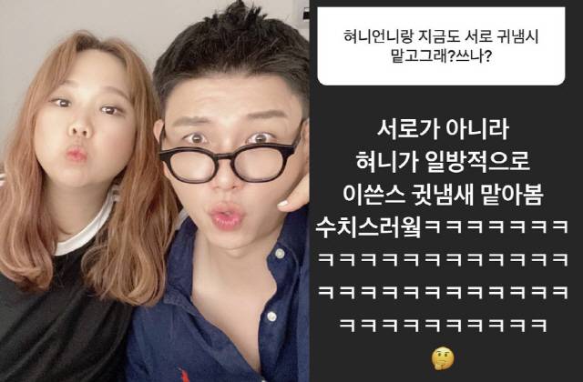 제이쓴은 "현희언니랑 지금도 서로 귀냄내 맡고 그래?"라는 질문을 받자 "서로가 아니라 현희가 일방적으로 이쓴스 귀 냄새 맡아봄. 수치스러워ㅋㅋㅋ"라고 답해 눈길을 끌었다.