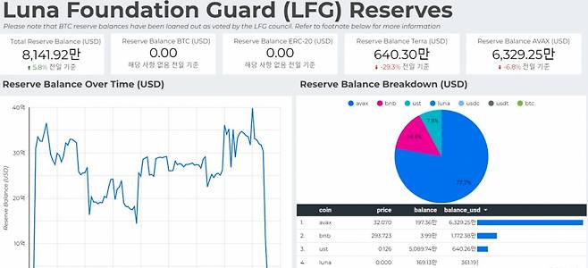 지난 7일 기준 LFG가 공개한 비트코인 보유량은 8만394개였다. 따라서 LFG는 지난 9~13일 '루나-테라 폭락사태' 기간동안 8만81개의 비트코인을 사용한 것으로 추산된다. 당시 비트코인 평균시세를 3만달러로 계산하면 24억 2430만 달러(약 3조 1164억 3765만원)에 달하는 금액이다.