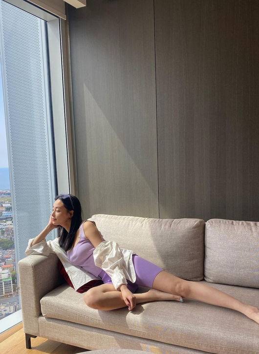 공개된 사진 속에서 이주연은 연보라색 민소매상의와 레깅스 차림으로 호캉스를 즐기고 있다.