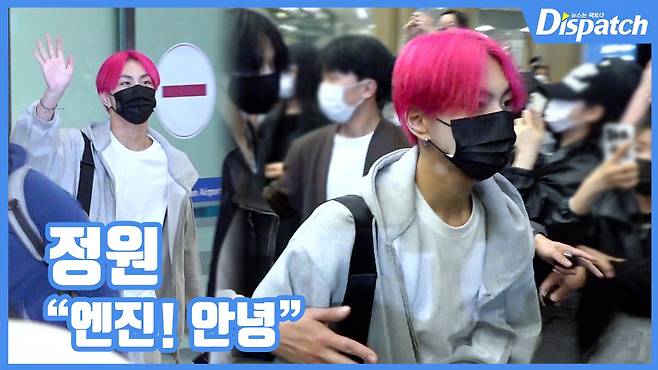 '엔하이픈' 정원이 입국장을 나서자마자 엔진을 향해 반갑게 인사했다.