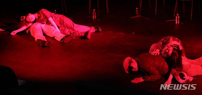 [서울=뉴시스] 조수정 기자 = 전쟁반대 퍼포먼스 코리아 낭독극 퍼레이드가 열린 16일 오후 서울 동숭동 드림시어터소극장에서 극단 MIR레퍼토리가 '전쟁터의 피크닉' 공연을 하고 있다. 전쟁터의 피크닉은 전쟁의 무익함과 어리석음을 통렬하게 풍자한 코믹 판타지 작품이다. 2022.05.16. chocrystal@newsis.com