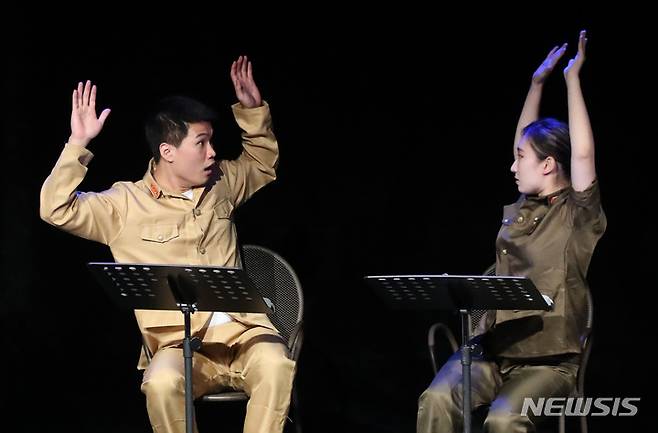 [서울=뉴시스] 조수정 기자 = 전쟁반대 퍼포먼스 코리아 낭독극 퍼레이드가 열린 16일 오후 서울 동숭동 드림시어터소극장에서 극단 MIR레퍼토리가 '전쟁터의 피크닉' 공연을 하고 있다. 전쟁터의 피크닉은 전쟁의 무익함과 어리석음을 통렬하게 풍자한 코믹 판타지 작품이다. 2022.05.16. chocrystal@newsis.com
