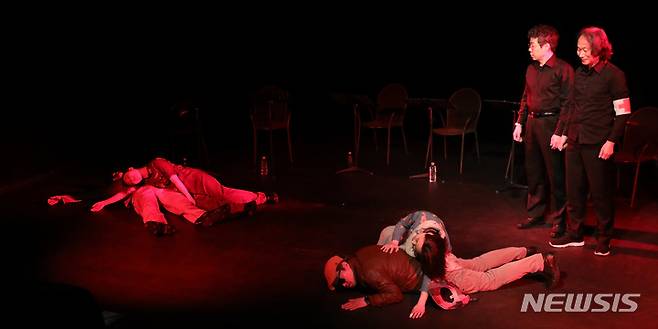 [서울=뉴시스] 조수정 기자 = 전쟁반대 퍼포먼스 코리아 낭독극 퍼레이드가 열린 16일 오후 서울 동숭동 드림시어터소극장에서 극단 MIR레퍼토리가 '전쟁터의 피크닉' 공연을 하고 있다. 전쟁터의 피크닉은 전쟁의 무익함과 어리석음을 통렬하게 풍자한 코믹 판타지 작품이다. 2022.05.16. chocrystal@newsis.com