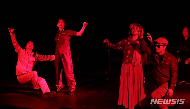 [서울=뉴시스] 조수정 기자 = 전쟁반대 퍼포먼스 코리아 낭독극 퍼레이드가 열린 16일 오후 서울 동숭동 드림시어터소극장에서 극단 MIR레퍼토리가 '전쟁터의 피크닉' 공연을 하고 있다. 전쟁터의 피크닉은 전쟁의 무익함과 어리석음을 통렬하게 풍자한 코믹 판타지 작품이다. 2022.05.16. chocrystal@newsis.com