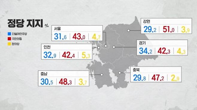 지지 정당 질문에서는 6개 지역 모두 국민의힘이 40%를 넘기며 민주당에 오차 범위 밖으로 우세했습니다.