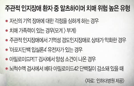 최근 학계에서 주목하고 있는 게 ‘주관적 인지장애’다. 이는 경도인지장애의 전단계에 해당되는데, 스스로는 기억력이 떨어졌다고 생각하지만 전문 신경심리검사를 해 보면 인지기능에 이상이 없는 게 특징이다. 즉 인지능력검사에서는 정상 수준의 뇌기능을 보이나 자신은 “기억력이 떨어졌다” “깜빡깜빡하는 경우가 잦아졌다”고 느낀다는 것이다.
