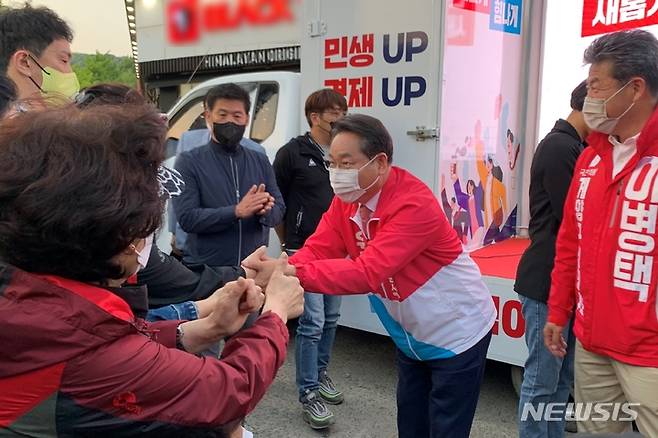 [인천=뉴시스] 이루비 기자 = 제8회 전국동시지방선거 인천시장에 출마한 유정복 국민의힘 후보가 16일 오후 인천 계양구 계산역 인근에서 지지자들과 인사하고 있다. 2022.05.16. ruby@newsis.com