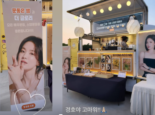 송혜교는 "경호와 고마워"라며 '정경호 드림'이라 적힌 현수막과 커피차를 인증해 훈훈하게 했다.
