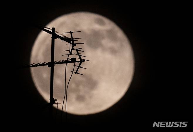 [부천=뉴시스] 정병혁 기자 = 미국 일부 지역과 남미, 유럽, 중동 등에서 개기월식이 관측된 16일 밤 경기 부천시 상공에 떠오르는 보름달에 아파트 안테나가 비춰지고 있다. 2022.05.16. jhope@newsis.com