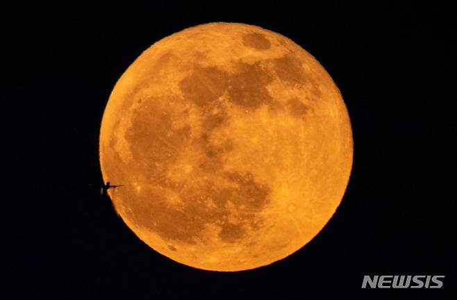 [부천=뉴시스] 정병혁 기자 = 미국 일부 지역과 남미, 유럽, 중동 등에서 개기월식이 관측된 16일 밤 경기 부천시 상공에 떠오르는 보름달 옆으로 비행기가 지나가고 있다. 2022.05.16. jhope@newsis.com