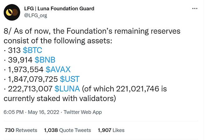 앞서 LFG는 공식 트위터를 통해 "보유 중이던 가상자산 대부분을 폭락장에서 UST 가격 방어를 위해 사용했다"고 밝혔다.
