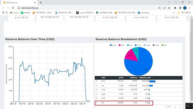 그런데 이날 저녁 9시30분 기준, LFG의 '루나 준비금 잔액 내역(Reserve Balance Breakdown)' 공식 홈페이지에 따르면 현재 LFG가 보유중인 비트코인 개수는 '0'개다.