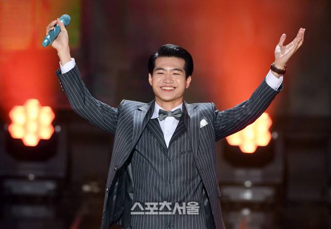 가수 조명섭이 16일 서울 마포구 SBS프리즘타워에서 진행된 SBS FiL, SBS MTV ‘더트롯쇼’ 생방송 무대에서 ‘세레나데’를 열창한 뒤 팬들에게 인사를 하고 있다. 2022. 5. 16.