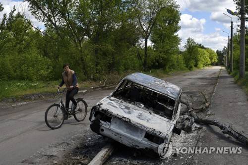 A man rides a bicycle past a car destroyed by shelling in a street in the village of Niu-York, Donetsk region, Ukraine, Monday, May 16, 2022. (AP Photo/Andriy Andriyenko)
