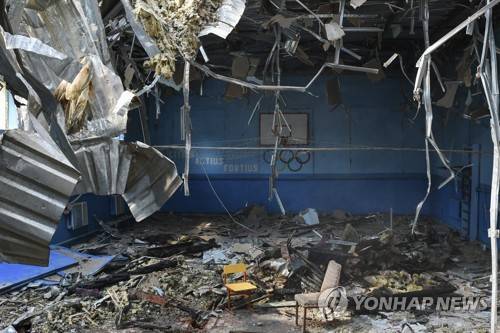 Olympics rings are seen painted on a wall in a destroyed gymnasium of a school after Russian shelling in the village of Druzhkivka, Donetsk region, Ukraine, Monday, May 16, 2022. (AP Photo/Andriy Andriyenko)