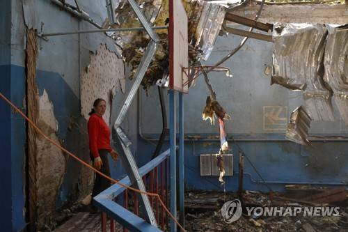 A sports teacher stands in a destroyed gymnasium of a school after Russian shelling in the village of Druzhkivka, Donetsk region, Ukraine, Monday, May 16, 2022. (AP Photo/Andriy Andriyenko)