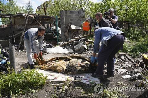 Police and volunteers exhume the body of a civilian killed by Russian shelling in the village of Malaya Rohan, on the outskirts of Kharkiv, Monday, May 16, 2022. (AP Photo/Andrii Marienko)
