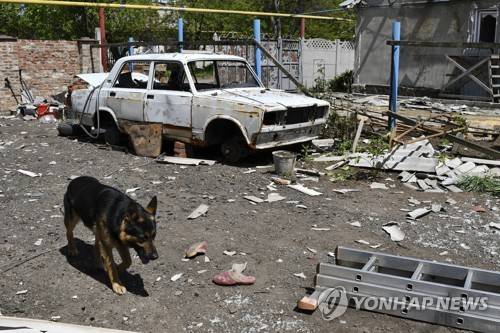 A dog walks past a damaged car in a yard of a house destroyed by Russian shelling in Toretsk, Donetsk region, Ukraine, Monday, May 16, 2022. (AP Photo/Andriy Andriyenko)