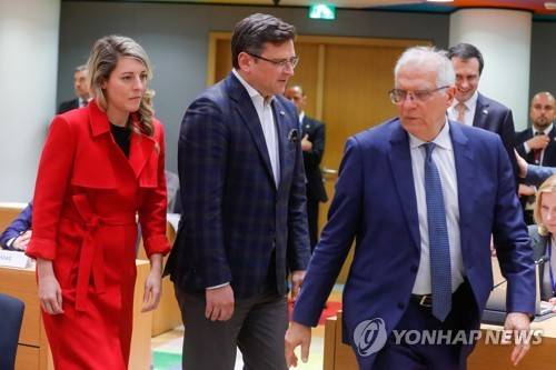 epa09950965 Ukraine's Foreign Minister Dmytro Kuleba (C) and Canadian Foreign Minister Melanie Joly are welcomed by High Representative of the EU for Foreign Affairs and Security Policy Josep Borrell (R) ahead the second part of a meeting of EU foreign ministers at the European Council, in Brussels, Belgium, 16 May 2022. European Union foreign ministers are discussing current affairs and exchanging views on the Russian aggression against Ukraine and the Global Gateway. EPA/STEPHANIE LECOCQ/ POOL