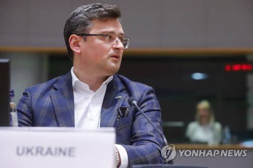 Ukraine's foreign minister Dmytro Kuleba participates at a meeting of EU foreign ministers at the European Council building in Brussels, Monday, May 16, 2022. European Union foreign ministers on Monday will discuss current affairs and have an exchange of views on the Russian aggression against Ukraine and the Global Gateway. (Stephanie Lecocq/Pool Photo via AP)